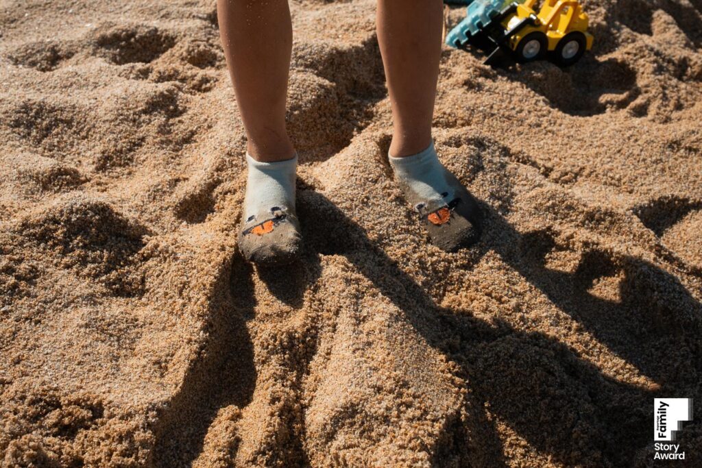 Wenn man die Geschichte zu diesem Foto nicht kennt, sieht es nach einer fröhlichen Situation aus. Es war lustig, dass er genau diese Socken an hatte. Aber fröhlich waren wir keineswegs. Mein Sohn holte sich gleich am ersten Tag an einem scharfen Felsen zwei lange Schnitte an beiden Füssen. Sie haben ihm so weh getan und er hat richtig Panik vor dem Schmerz im Salzwasser entwickelt. Deshalb ging er die nächsten zwei Tage nur noch so ans Meer und war mega schlecht drauf, weil es viel zu heiss war, um nur am Strand zu sein. Zum Glück überwand er es dann am dritten Tag und konnte auch wieder ins Wasser.